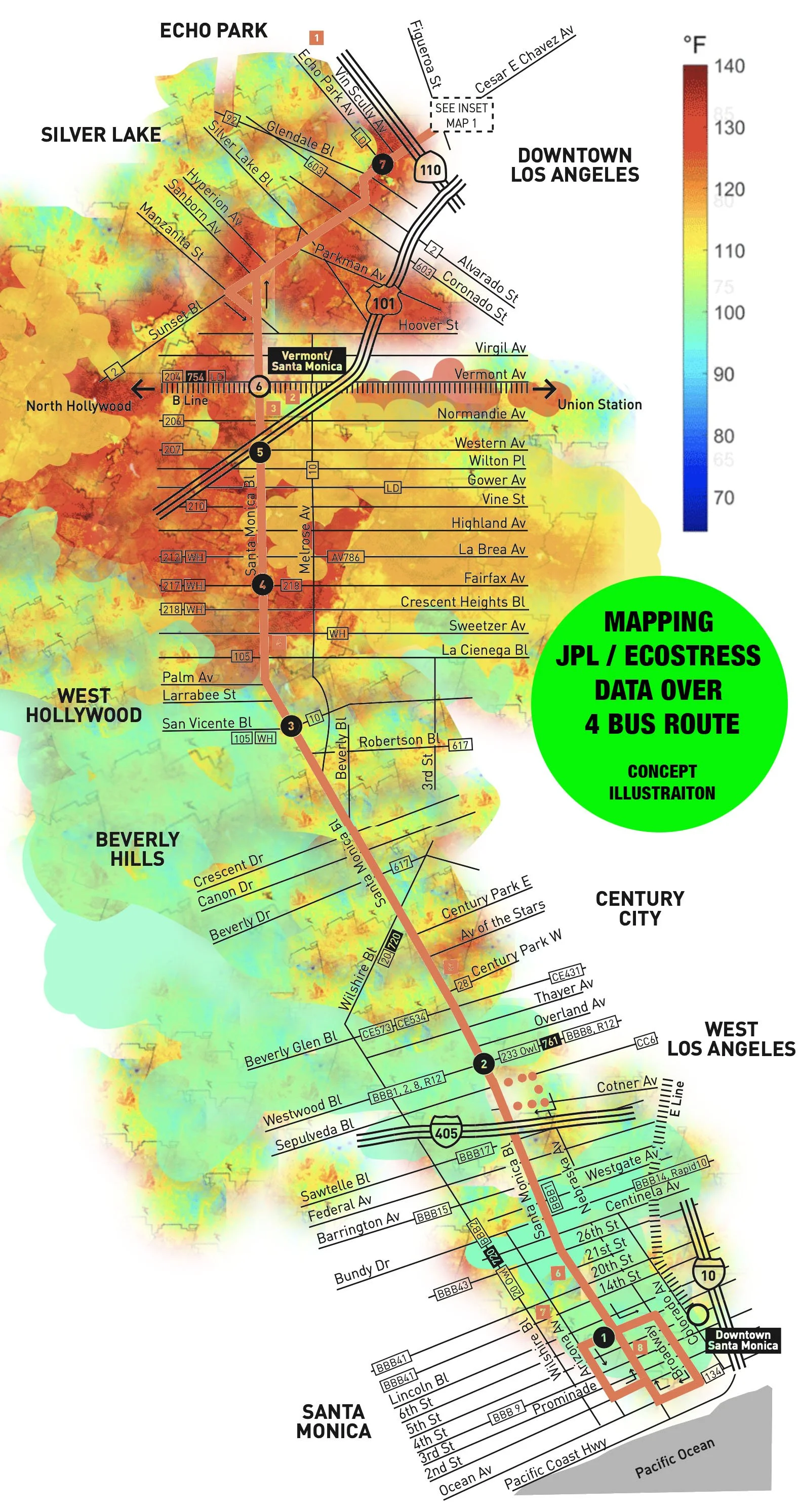 Fig.1. Conceptual mock-up/map of ECOSTRESS data over Metro bus route No.4.